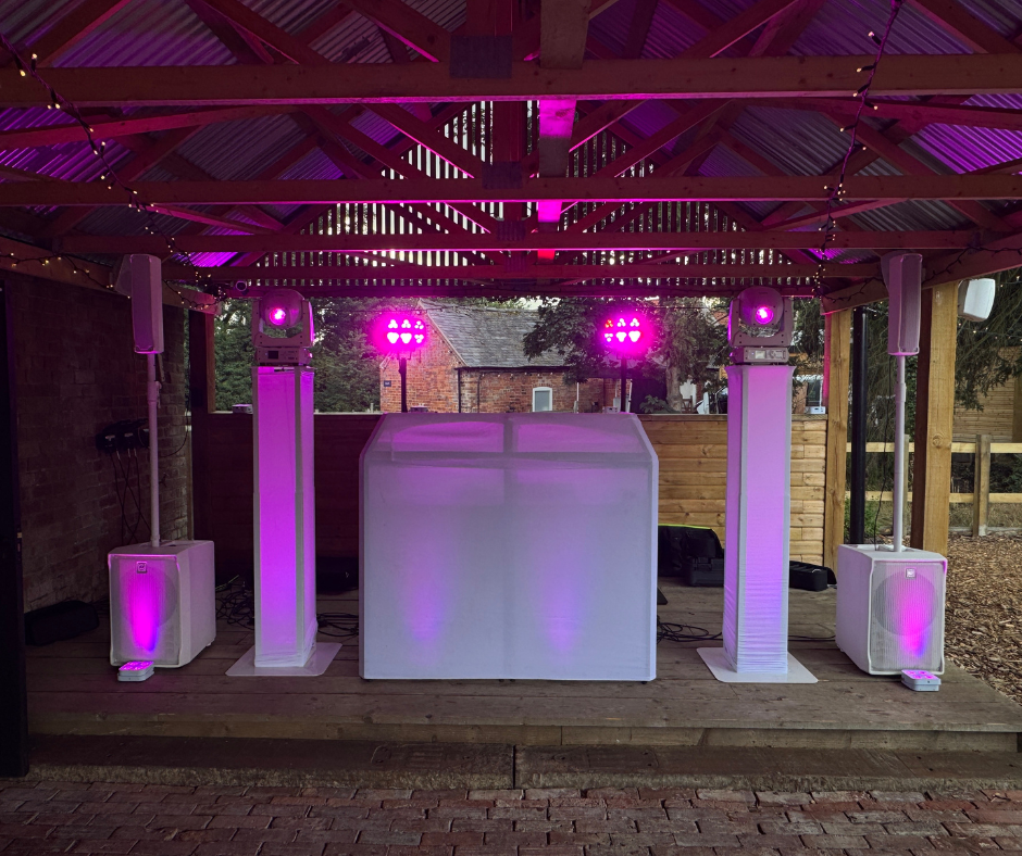 - Modern white DJ booth and matching speakers for a clean, contemporary look.